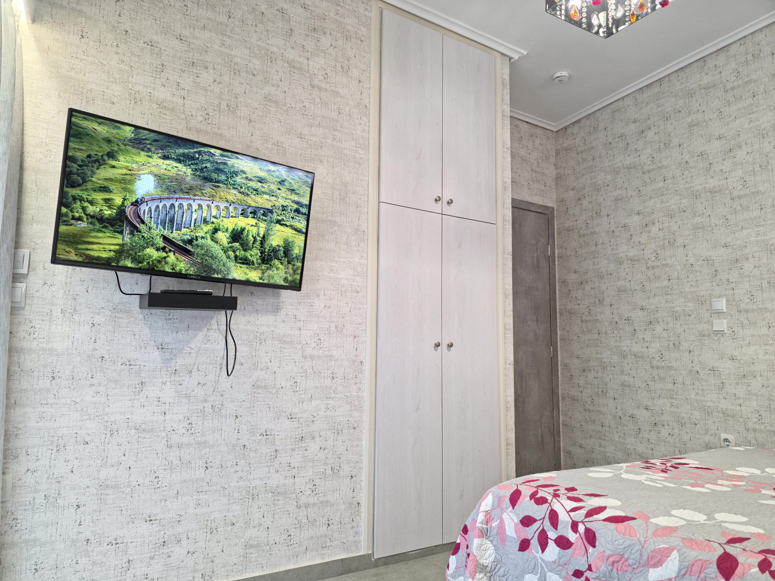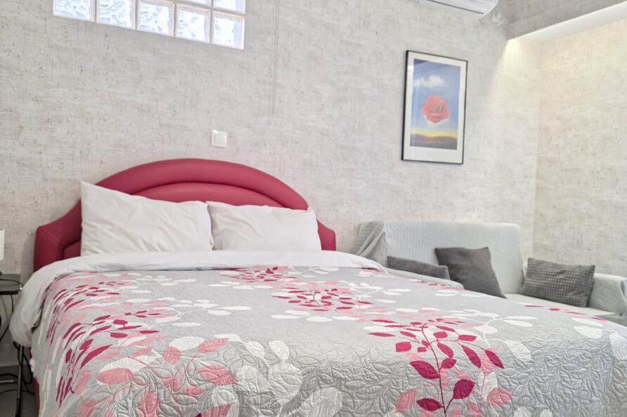 The apartment is fully air-conditioned and equipped with high-speed internet (50 mbps). Its inviting bedroom features a new, plush double bed and opens onto a charming wrap-around balcony perfect for enjoying meals or coffee amidst fresh air. Additionally, the sofa conveniently converts into a comfortable bed suitable for one adult or two small children.